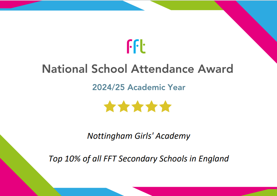 The Nottingham Girls' Academy (in line with government directives) expects pupils to attend school for at least 97% of the time. This equates to half a day's absence every two weeks. If a pupil is absent for a whole day their attendance for that week drops to 80%.